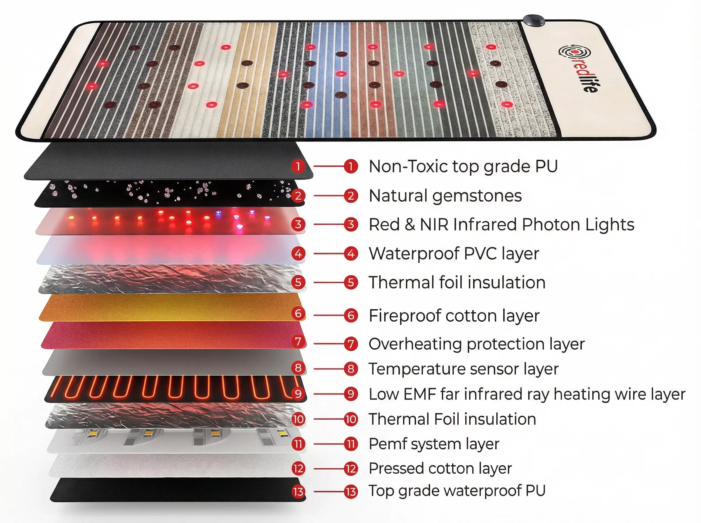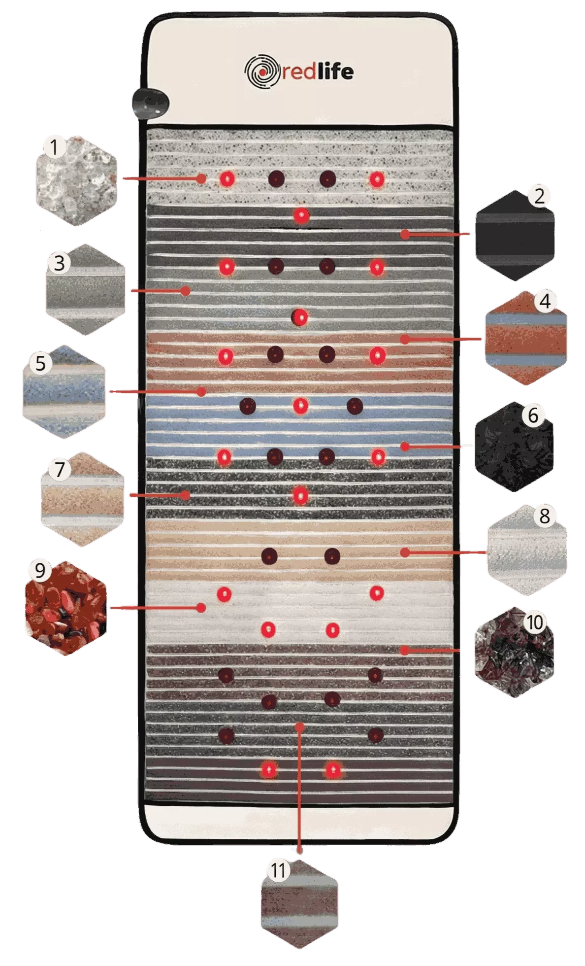 At the heart of the RedLife PEMF Bio-Forge mat is a precision-engineered 11-stone architecture, strategically mapped to amplify every therapeutic modality: